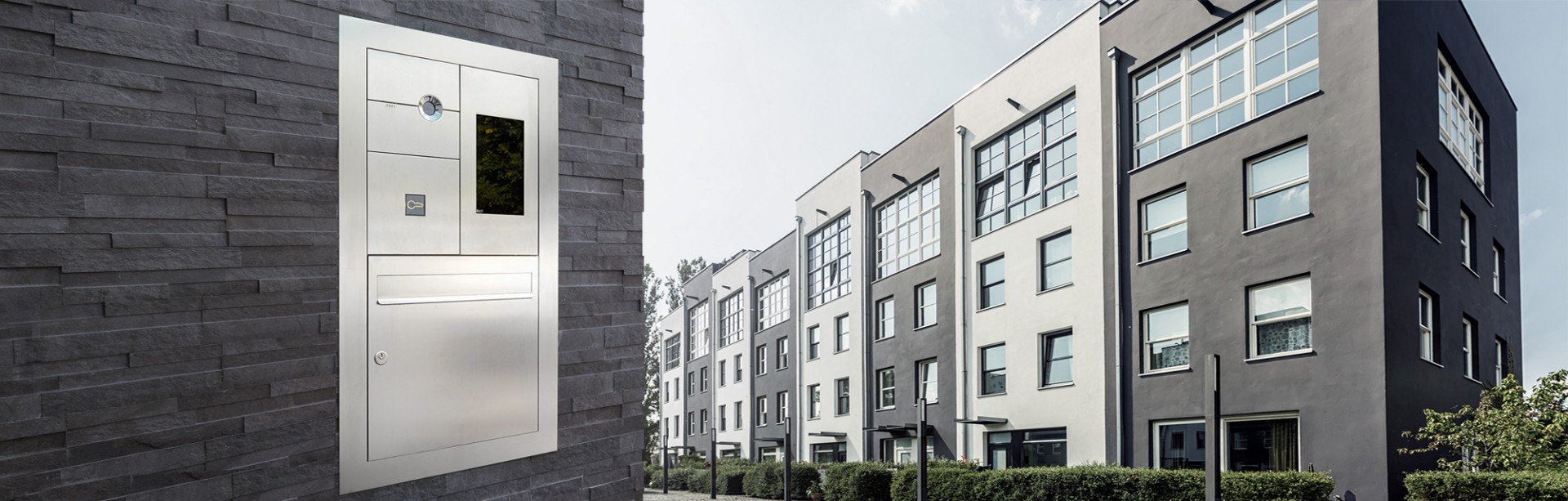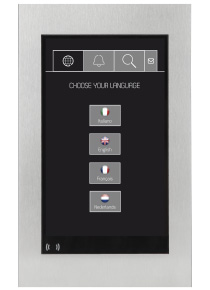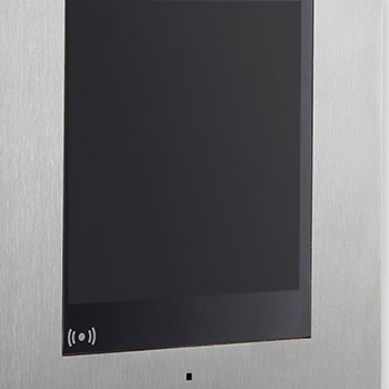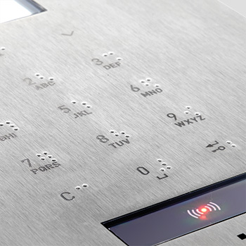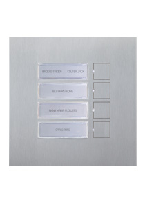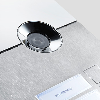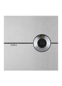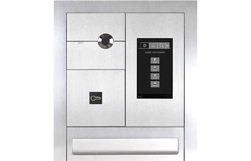 Màn hình ra vào bằng thép không gỉ với lớp hoàn thiện chải. Khả năng tùy biến cao: từ giá đỡ sàn đến giải pháp lắp chìm, việc chèn hộp thư và khắc laser trên thép.